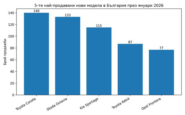 Лидер за първия месец на новата година е Toyota Corolla със 140 регистрации, която по традиция е един от най-предпочитаните модели на родния пазар. На второ място се нарежда друг хитов за България модел – Skoda Octavia, от която са продадени само със 7 броя по-малко. На трето място в общото подреждане и на първо сред моделите тип SUV се нарежда Kia Sportage (115), следвана от Toyota RAV4 (87) и Opel Frontera (77). Челната десетка допълват още Kia Ceed (70), Skoda Kodiaq (69), Hyundai Tucson (67) и Skoda Kamiq/Toyota C-HR (всеки от тях – с по 56).