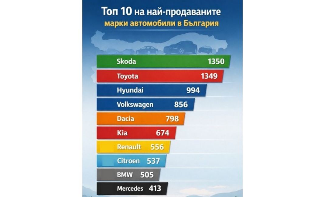 С 1350 регистрации Skoda е водач по продажби на нови автомобили в България за първото тримесечие на 2026 г. Почти идентичен брой – само с 1 едно МПС по-малко, постига Toyota (1349). На трето място излиза Hyundai (994), следван от Volkswagen (856). Традиционният бестселър за българския пазар – нискобюджетната румънска марка Dacia, е едва на пета позиция със 798 автомобила. По-нататък в класирането следват Kia (674), Renault (556) и Citroen (537). Интересен факт е, че най-добре класиралата се премиум марка – BMW (505), постига почти толкова продажби, колкото двата масови френски бранда преди нея. Mercedes допълва челната десетка (413), докато Audi постига почти двойно по-слаб резултат – 236 броя и едва 14-то място. От новите играчи на пазара – китайските марки, най-много продажби реализира Forthing (195), следвана от Geely (137).