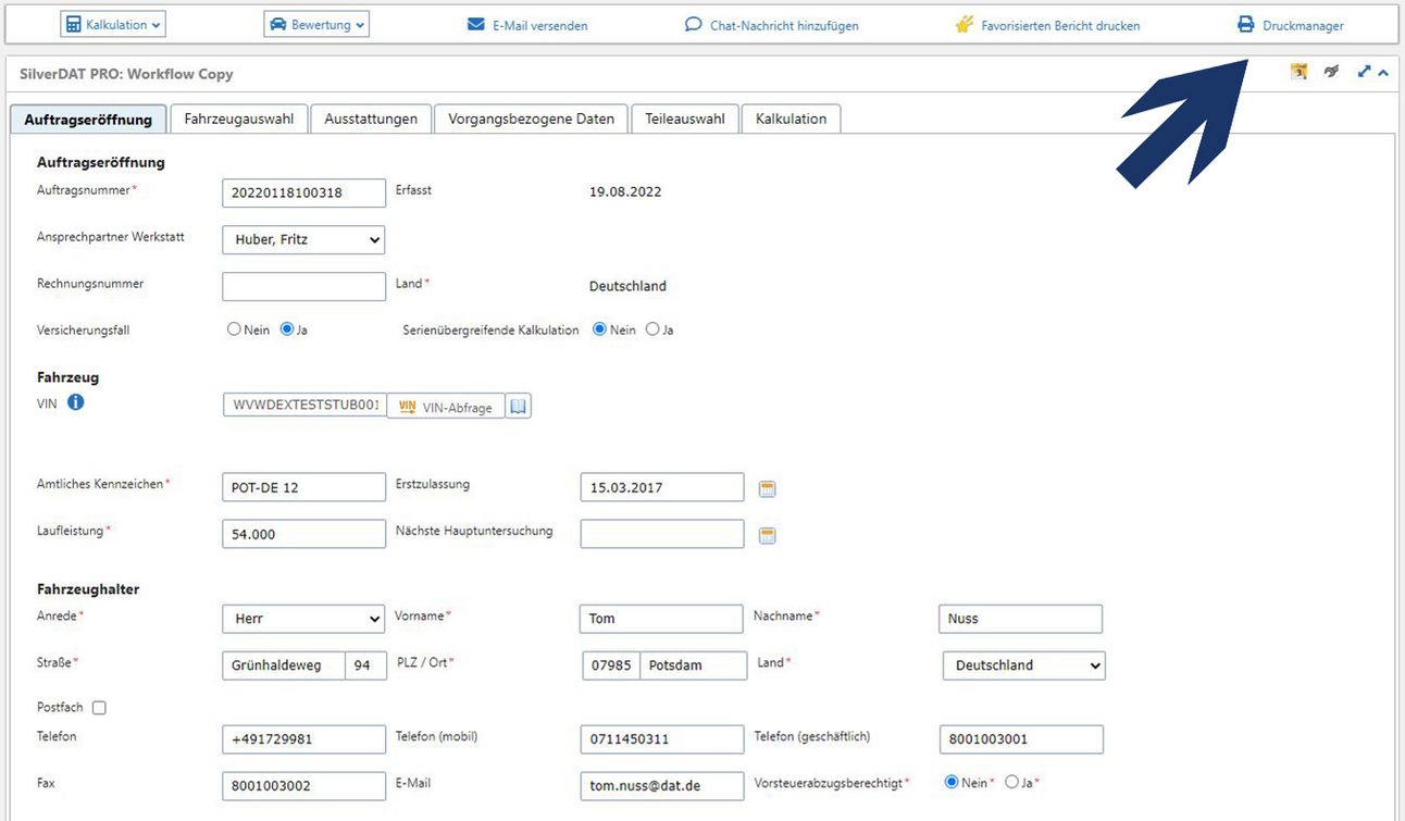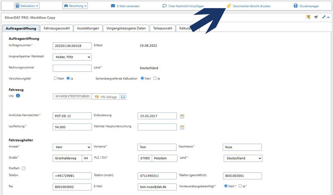 Klicken Sie dafür in der Auftragsmenüleiste auf „Favorisierten Bericht drucken“, um den Druck sofort auszulösen.
