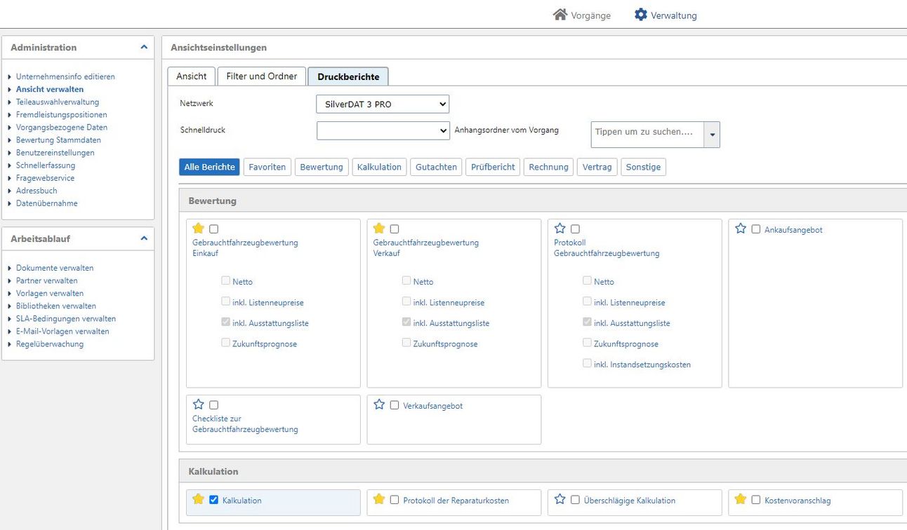 Damit Sie die wichtigsten Berichte sehen können gibt es den Favoritenbereich. Um einen Bericht als Favorit zu kennzeichnen, klicken Sie auf den Stern des Druckberichts. Wenn Sie nun in den Favoritenbereich wechseln, sehen Sie alle favorisierten Berichte.