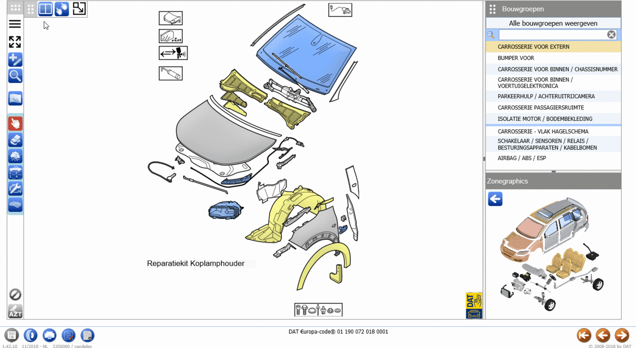 Deze nieuwe functionaliteit helpt gebruikers om snel onderdelen te selecteren door middel van een voorselectie van de reparatiecode en de zijde (links, rechts en/of enkele onderdelen). Alle niet relevante onderdelen worden vervolgens automatisch niet-selecteerbaar gemaakt.